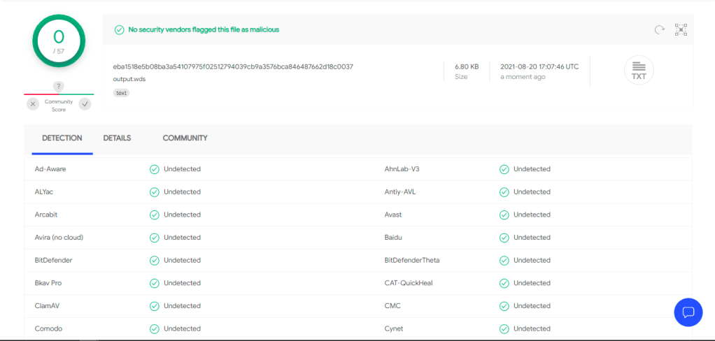 On a side note, the .wds script is not flagged by any AVs, mostly due to its unusual format.